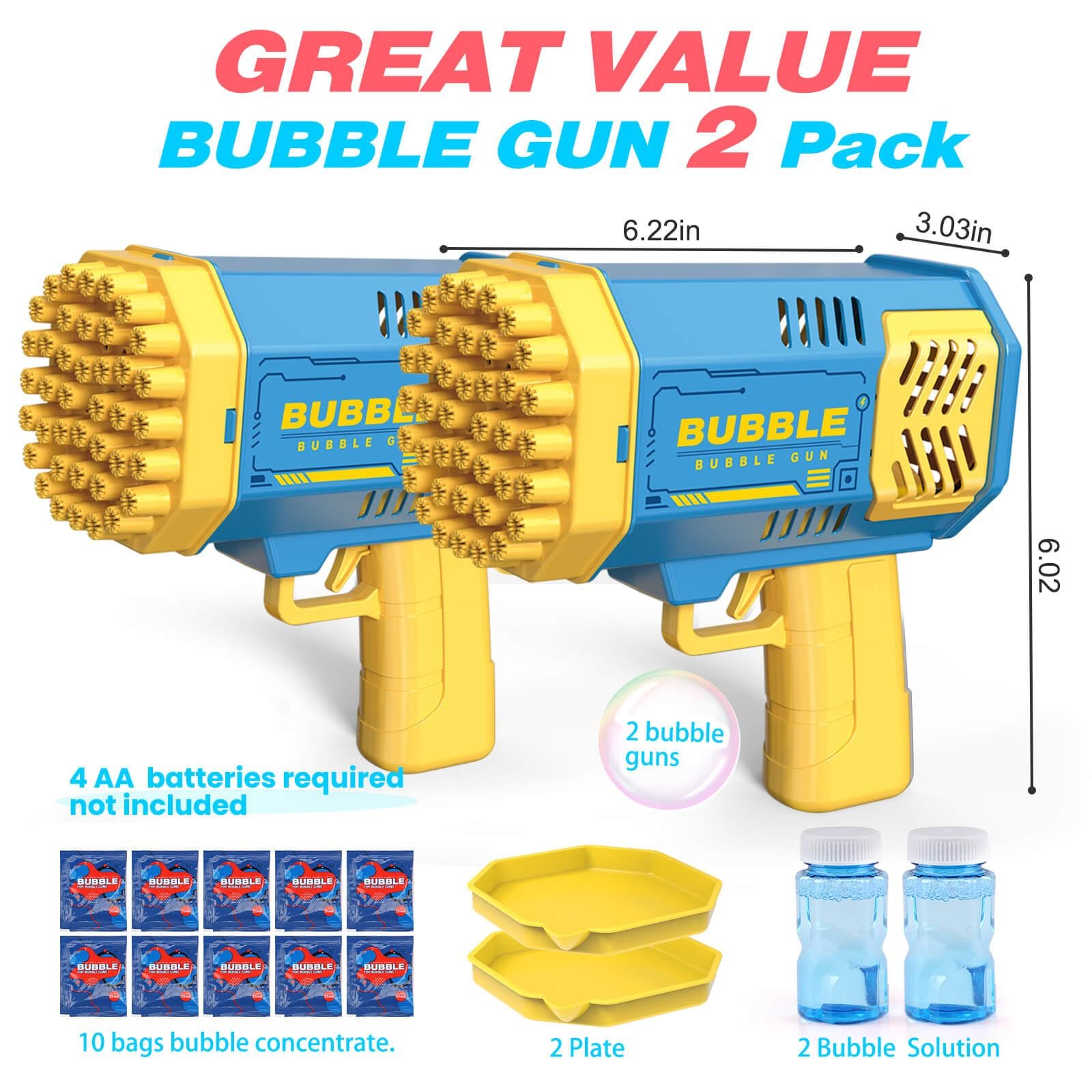 - BUBBLE MACHINE 2-PIECE SET: This bubble machine includes 2 pieces of bubble wands with extra 2 refills, and 10 bags of bubble concentrate. And 2 colors of bubble blower are provided to match any color